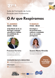 15 Janeiro, 18h00-19h30 – “A Qualidade do Ar em Portugal: a poluição atmosférica e hábitos de mobilidade da população”, com Francisco Ferreira, Diretor do CENSE – Centro de Investigação em Ambiente e Sustentabilidade (NOVA FCT)